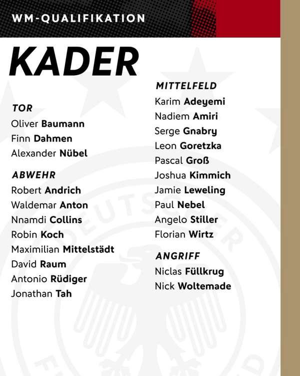 中场方面,多特蒙德的阿德耶米、美因茨的阿米里、拜仁的格纳布里与格雷茨卡、多特的格罗斯、拜仁的基米希、斯图加特的勒威林、美因茨的内布尔、斯图加特的斯蒂勒以及利物浦的维尔茨获得征召。