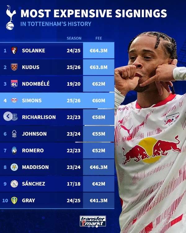 除了上述三位,热刺近年来的高价引援还包括:理查利森(5800万欧,22-23赛季从埃弗顿加盟)、布伦南-约翰逊(5500万欧,23-24赛季从诺丁汉森林加盟)、罗梅罗(5200万欧,22-23赛季从亚特兰大加盟)。此外,麦迪逊(4630万欧,23-24赛季从莱斯特城加盟)、达文森-桑切斯(4200万欧,17-18赛季从阿贾克斯加盟)以及阿奇-格雷(4130万欧,24-25赛季从利兹联加盟)也位列队史引援榜前十。