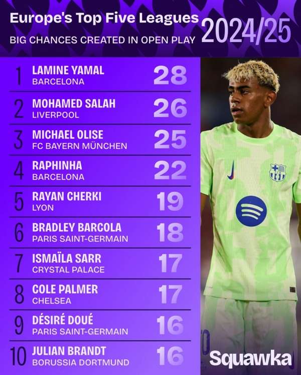 榜单中还包括了多位表现出色的球员。巴塞罗那队友拉菲尼亚以22次排名第四,而法甲里昂的谢尔基(19次)和巴黎圣日耳曼的巴尔科拉(18次)分列第五和第六。值得注意的是,伊斯梅拉-萨尔和切尔西的帕尔默同以17次并列第七,雷恩的杜埃与多特蒙德的布兰特则以16次并列第九。