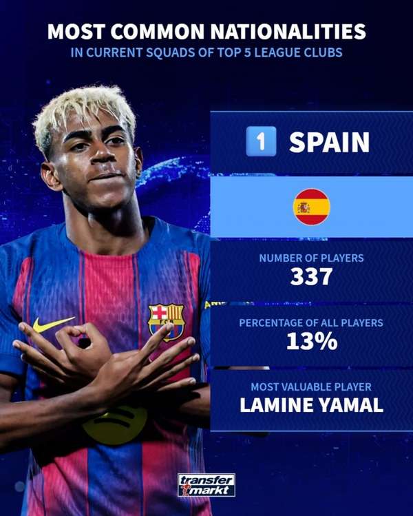 法国球员以297人的数量位列次席,德国以245人排名第三。传统足球强国意大利和英格兰分别贡献208人和192人,分列第四、五位。值得注意的是,南美足球强国巴西成为非欧洲国家中的代表,共有78名球员效力于五大联赛。