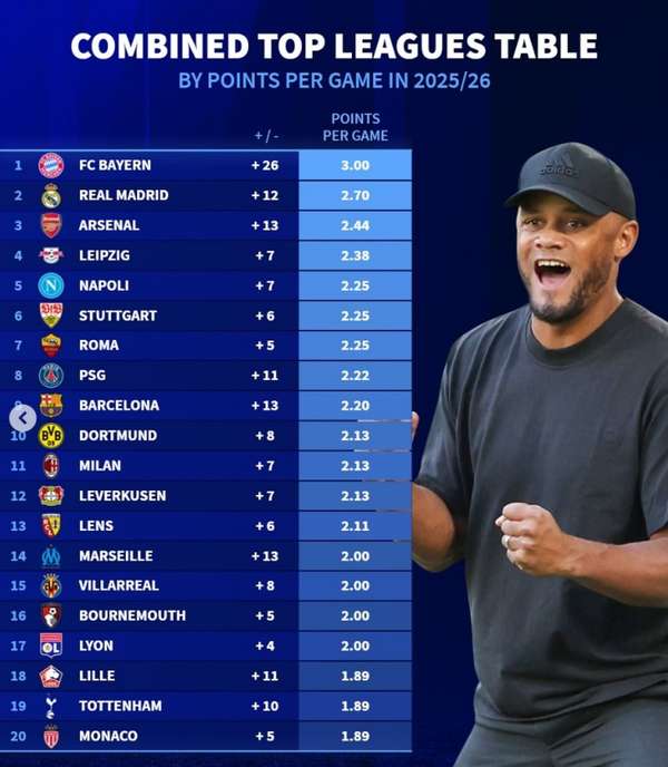 在这份结合场均积分与净胜球数的综合榜单中,德甲霸主拜仁以+26球的巨大净胜球优势稳居第一。皇马(+12球)与阿森纳(+13球)分别以2.70分和2.44分紧随其后。莱比锡(+7球)以2.38分位列第四,成为德甲另一支表现突出的球队。