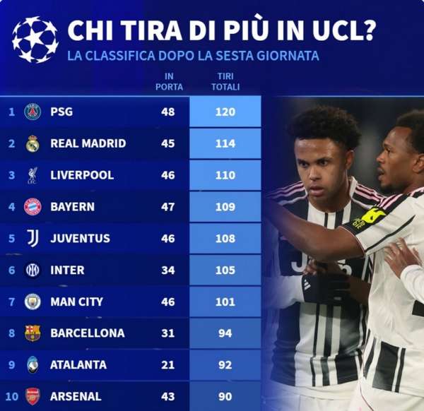 榜单前五名呈现胶着态势:拜仁慕尼黑109次射门(47次射正)排名第四,尤文图斯108次射门(46次射正)位居第五。值得注意的是,国际米兰虽然射门数达到105次,但仅有34次射正,转化效率有待提升。