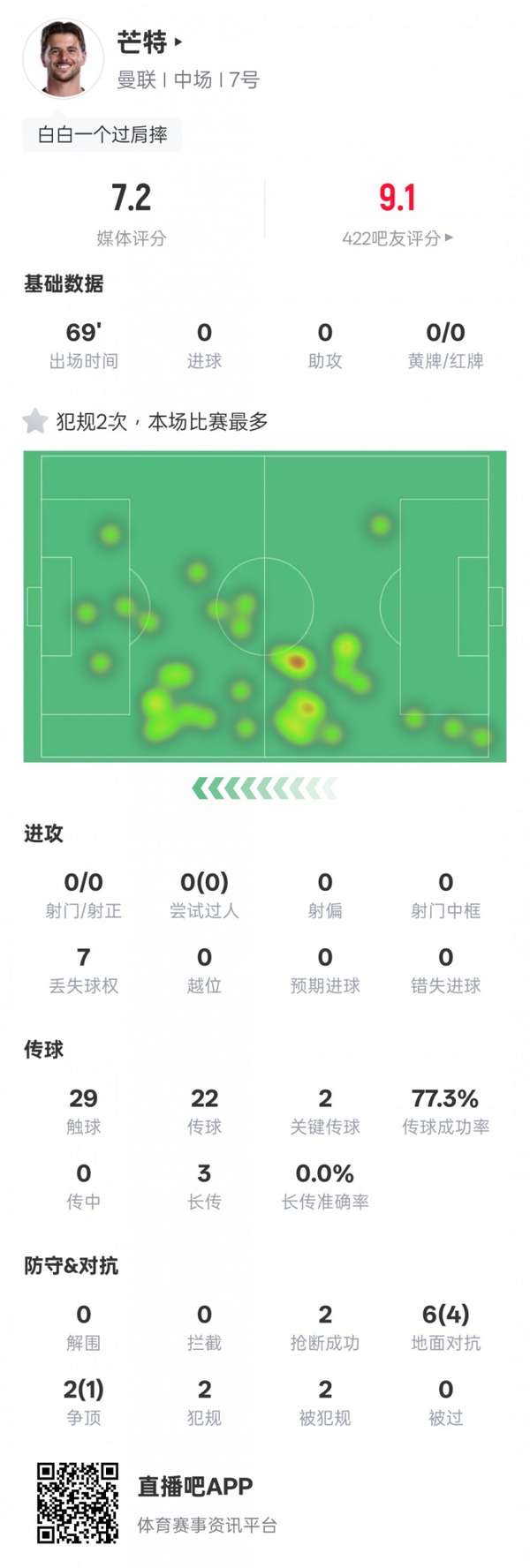 整场比赛,芒特触球29次,完成22次传球和3次长传。他在比赛中犯规2次,同时被侵犯2次。最终,这位英格兰中场获得了7.2的评分,在球队整体表现中起到了关键作用。